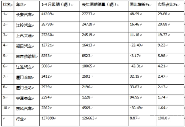 特点四、前4月累销:长安强势夺冠、江铃及上汽大通分列二、三;TOP10同比7增长3下降,宇通客车领涨